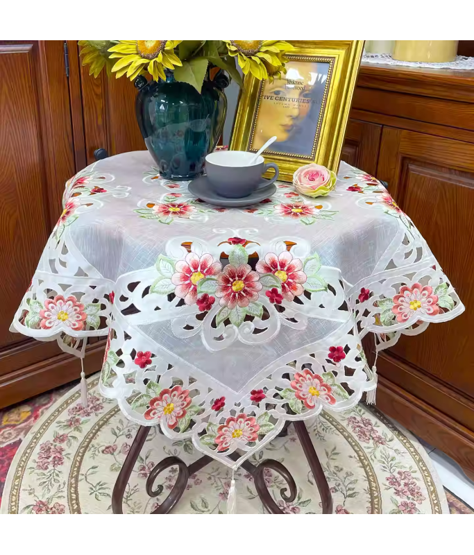 Red Flower Embroidered Lace Square Tablecloth, Euro Style Dining Table Cover for Home Kitchen Decoration