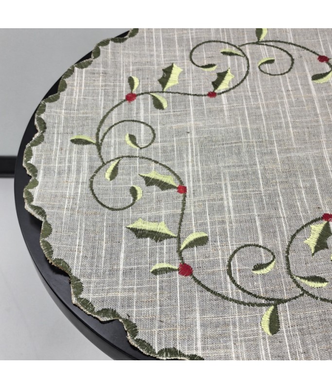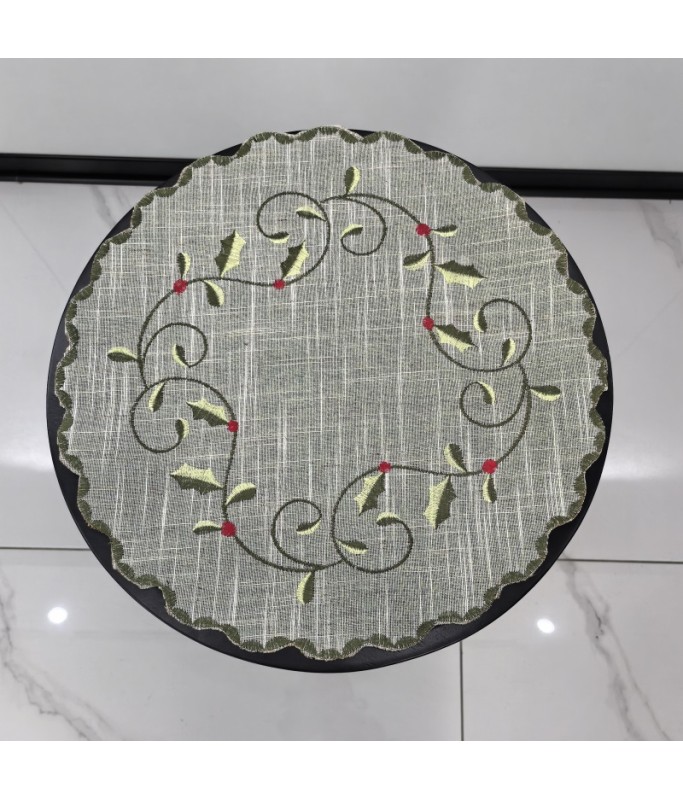 Round Linen Tablecloth, Leaf Pattern Embroidered Table Cover